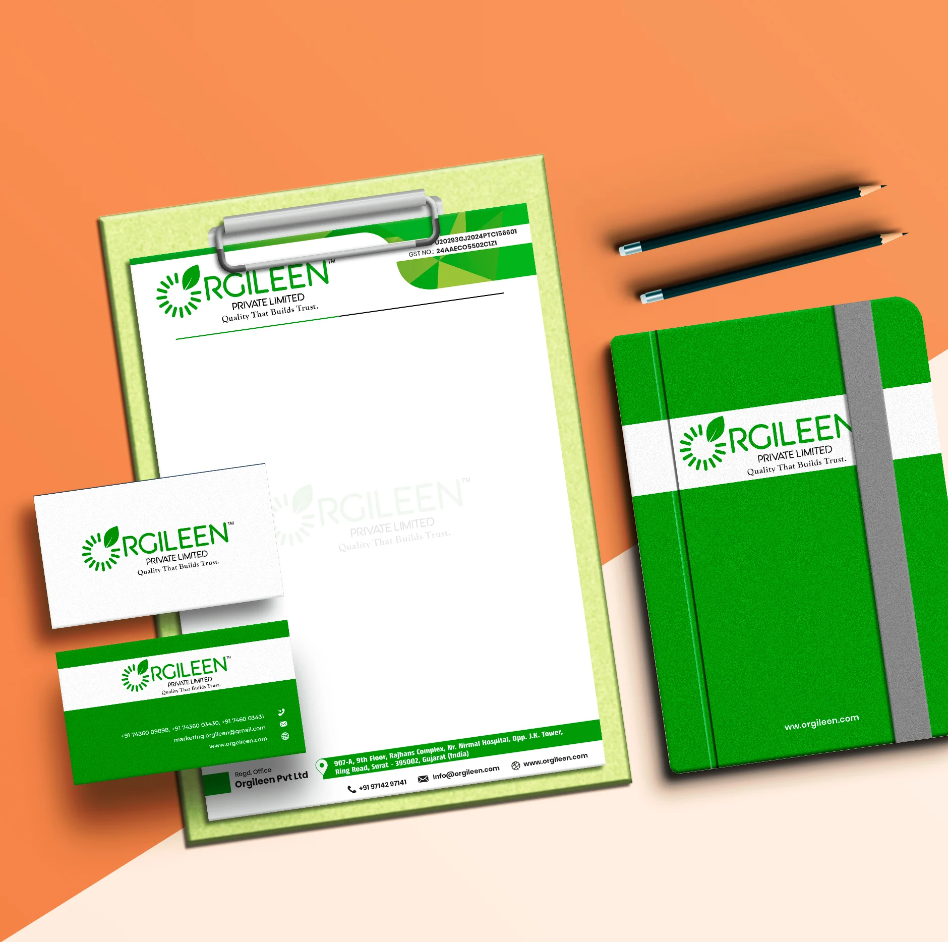 Every interaction counts, and Orgileen’s stationery made sure the brand looked professional at every step. We designed business cards, letterheads, and official documents that carried their identity with elegance and consistency. The designs reflected their natural roots while maintaining a modern touch. From meetings to correspondence, every detail reinforced Orgileen’s values of trust, quality, and authenticity.